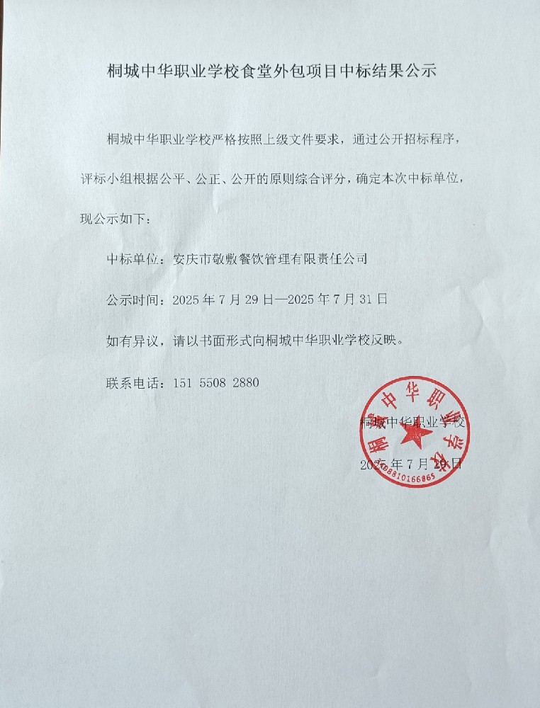 • 2025-07-29桐城中华职业学校食堂外包中标结果公示